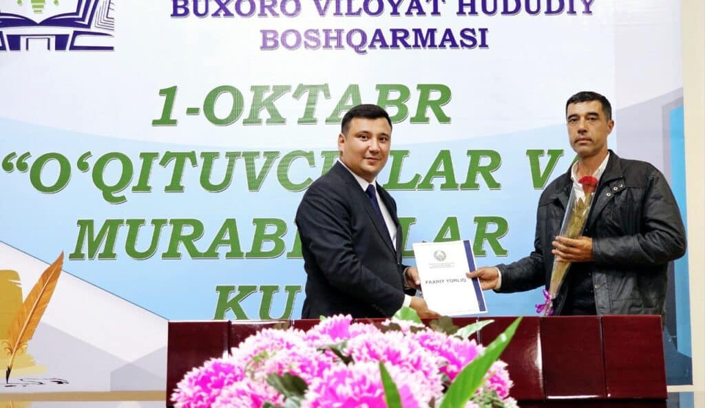 1-oktyabr — “O‘qituvchi va murabbiylar” kuni munosabati bilan ta’lim-tarbiya tizimida alohida o‘rnak ko‘rsatgan xodimlardan professional ta’lim muassasalari bir guruhpedagog xodimlarga O‘zbekiston Respublikasi Oliy ta’lim, fan va innovatsiyalar vazirning Faxriy yorlig‘i hamda Tashakkurnomalarini Buxoro viloyat hududiy boshqarmasi boshli’g’i A.Naimov tomonidan topshirildi.